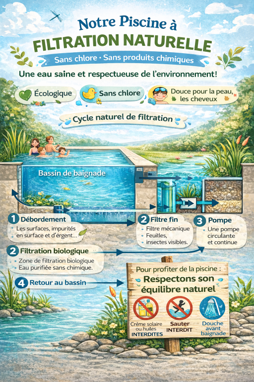 Aucun produit chimique ne viendra agresser votre jolie peau, la piscine et filtrée entièrement par un bassin de plantes.